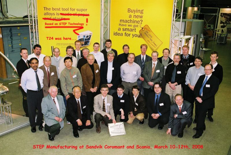 Middle row: Sid Venkatesh (Boeing), Leon Xu (Boeing), Seok Won Lee (Dresden University of Technology), K-G Wiklander (Sandvik Tooling), Martin Hardwick (Step Tools Inc), Kari Harju (Sandvik Coromant), Magnus Lundgren (KTH), Michael McGlauflin (NIST), David Odendahl (Boeing), Peter Sandström (Siemens AB)