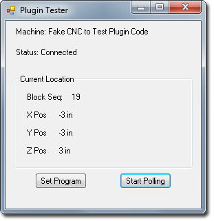 Write code to connect to your machine tool, return the current X/Y/Z coordinates, the current block number, and a few others. The TestForm project makes a simple dialog that continually calls your DLL and shows the values returned.